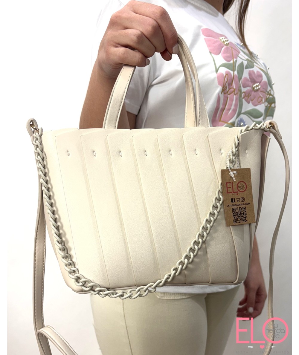 Bolso super cuqui, con cadena decorativa de metal del color del bolso, también incorpora asa larga para colgar tipo bandolera