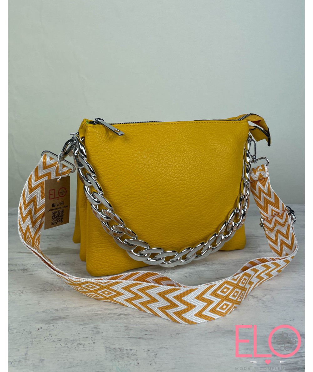 Lleva asa ajustable en tela bordada y una corta en forma de cadena de color plata.