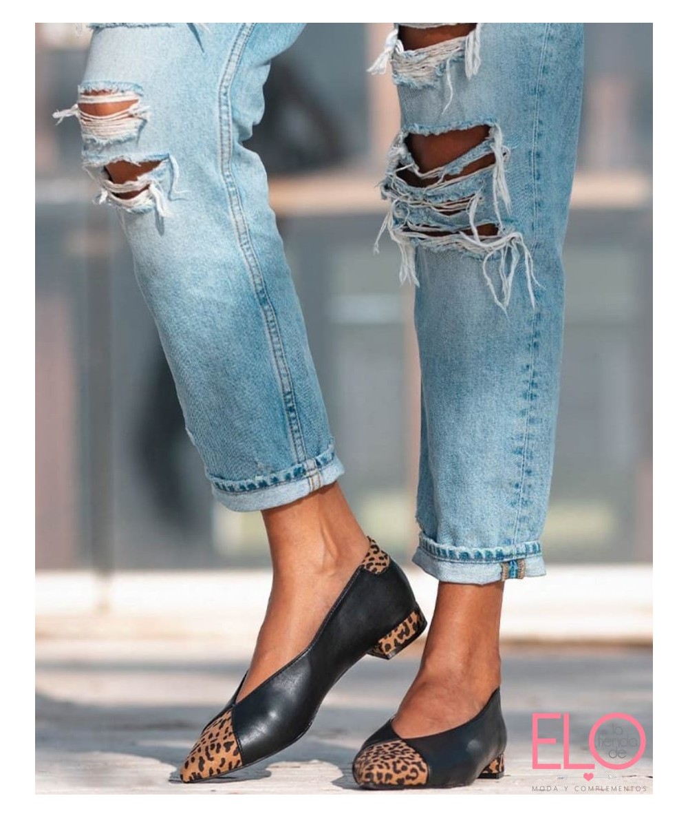zapatos de tacón bajito de color negro, de punta triangular de estampado de leopardo