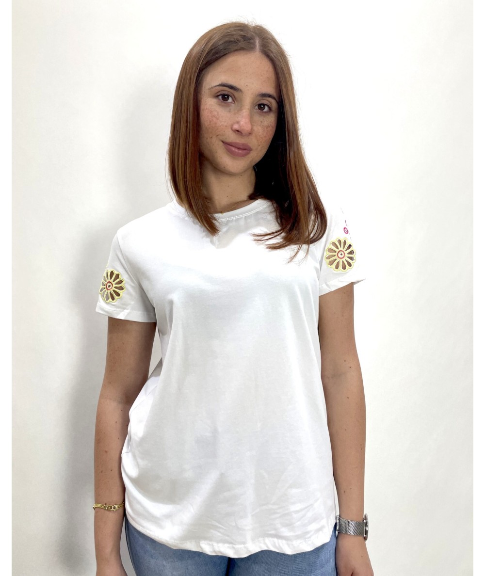 La maga lleva un diseño troquelado en forma de flores con bordados de colores.