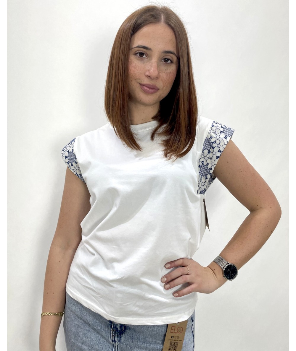 Camiseta con detalle en las mangas , lleva una sobretela bordada con hilo azul.