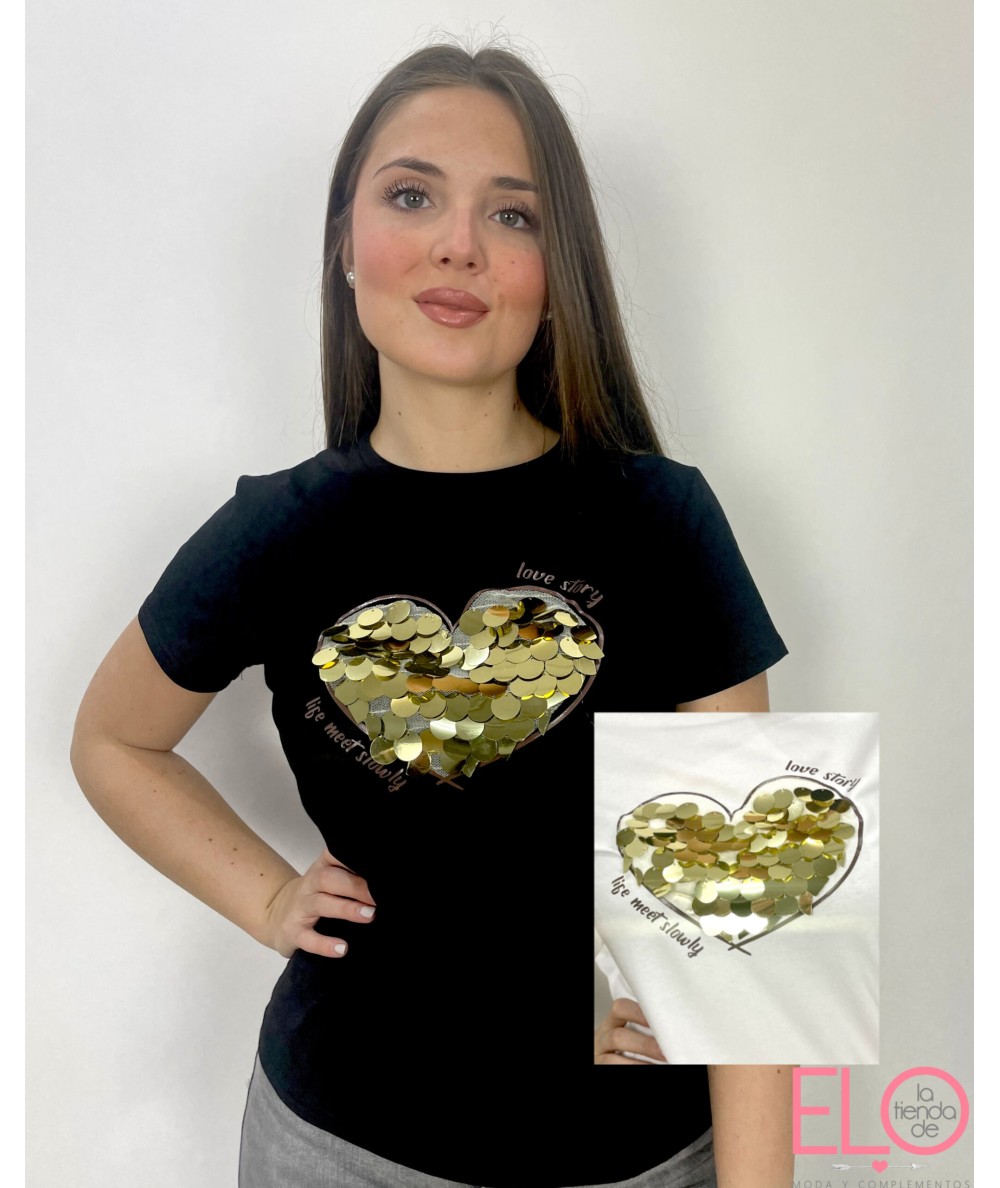 Lleva un corazón de color dorado con lentejuelas grandes.