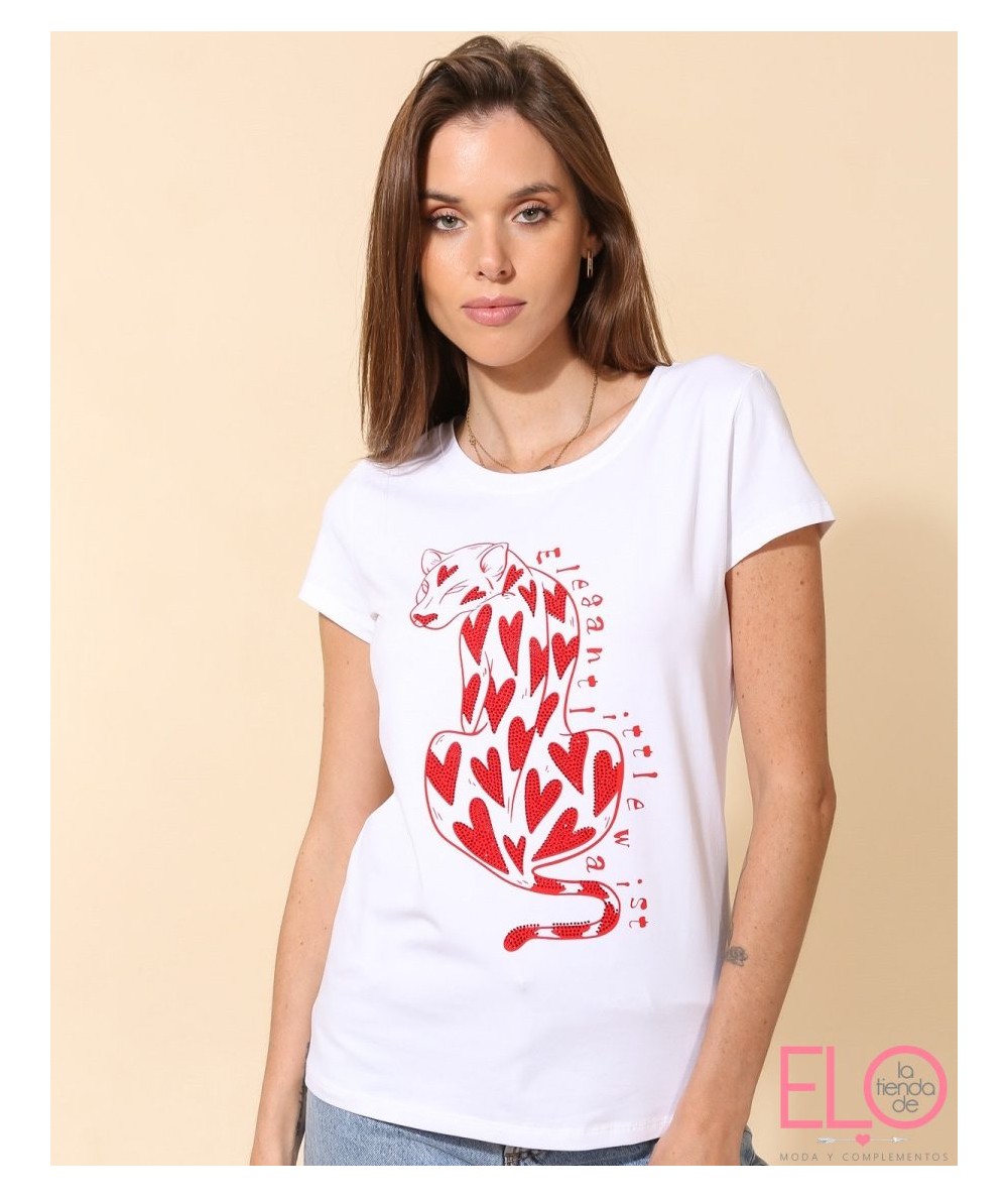 Tiene un felino de color rojo con corazones, decorado con brillos rojos.