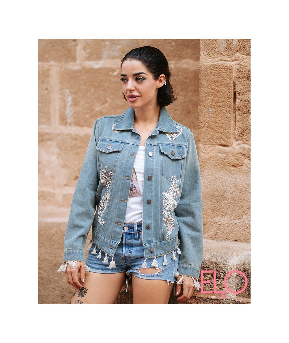 Con bordados de color blanco y piedras en el frente y la espalda.