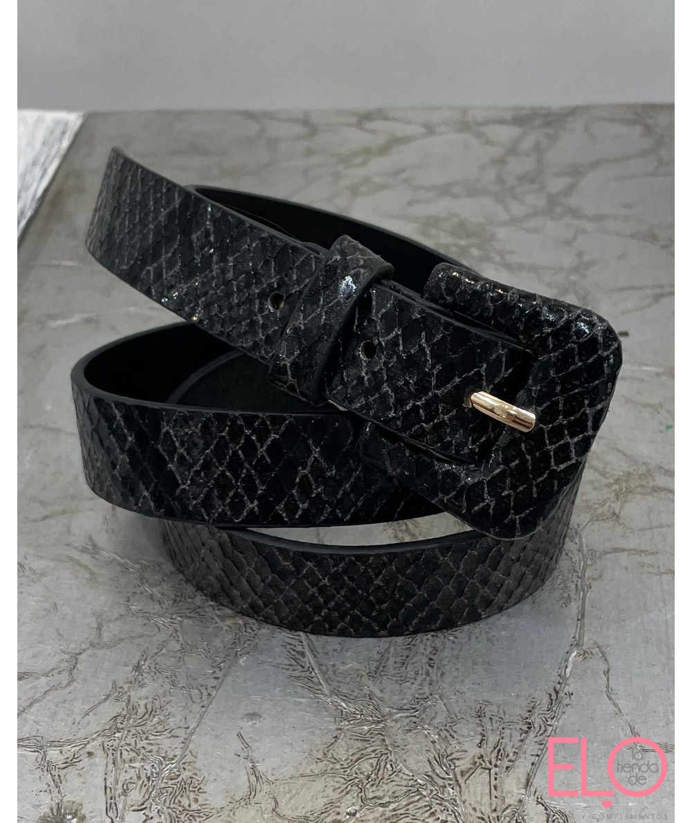 cinturón en polipiel negro con grabado de piel de serpiente.