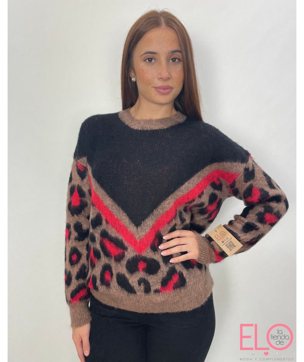Jersey de color camel y negro con estampado de animal print de color rojo.
