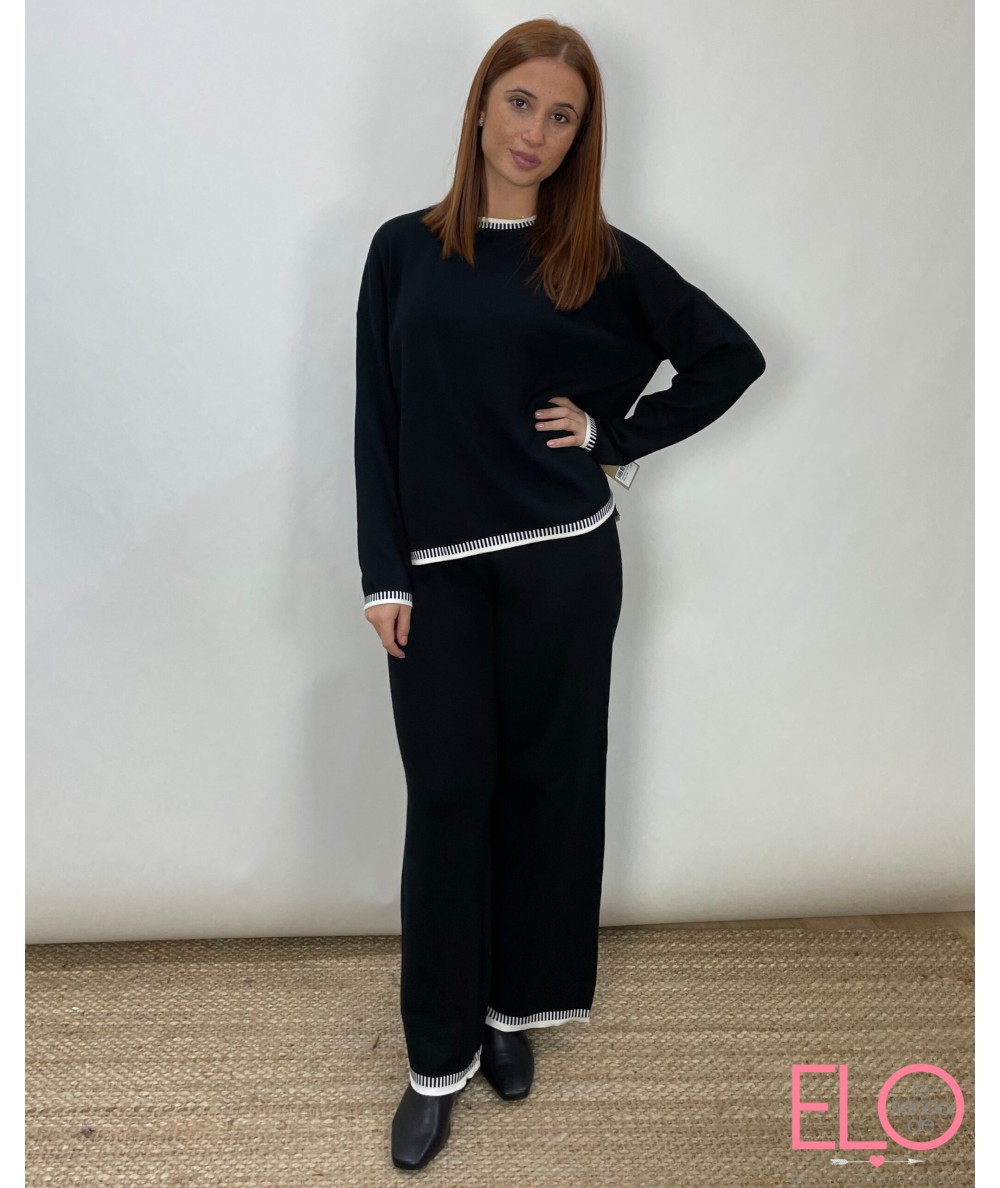 El borde del jersey y el bajo del pantalón tiene un dibujo en blanco.