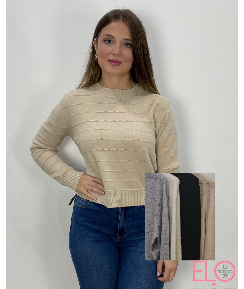 El punto forma unas rayas caladas que le dan un toque mas chic al jersey.