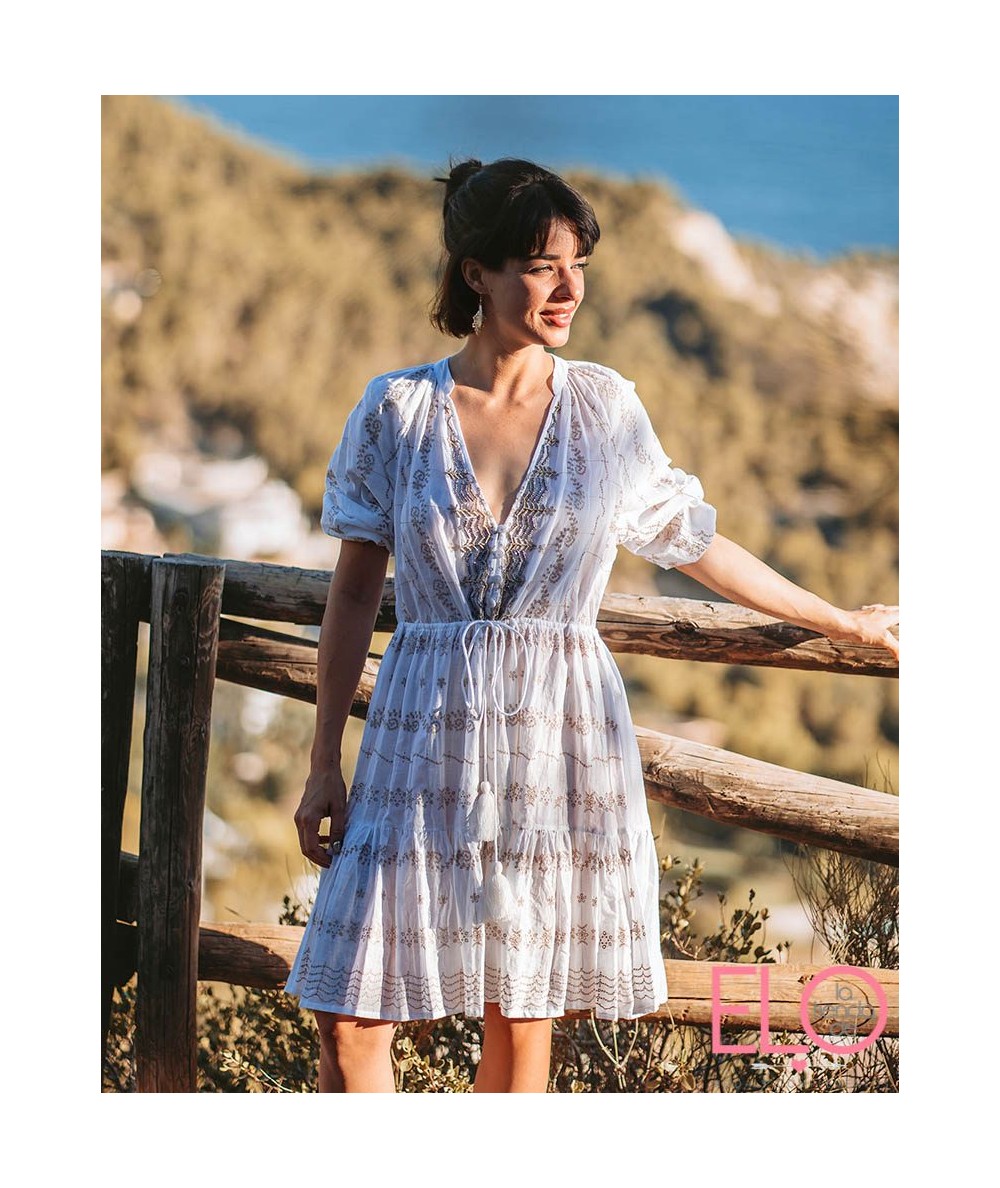 Lleva diseños bordados en color camel y piedras decorando el cuello.