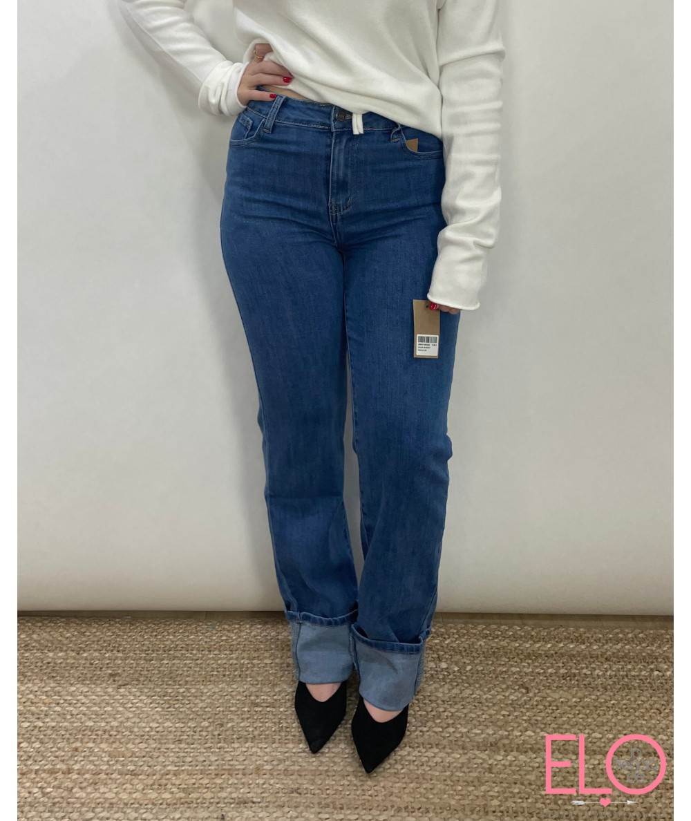 De corte recto y pata ancha, la pata mide 22 cm y lleva dobles.