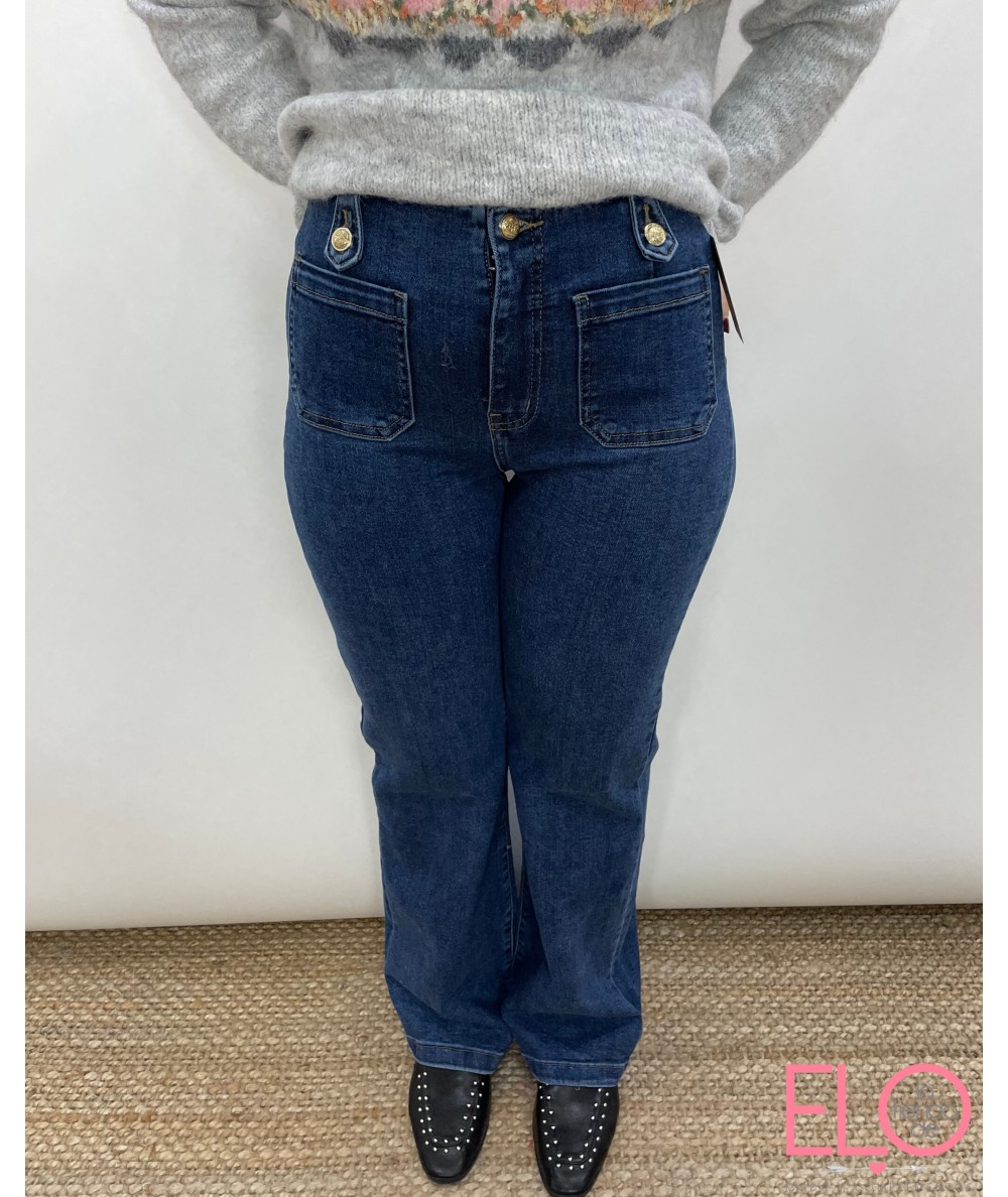 De cuatro bolsillos, los delanteros llevan botones dorados.
