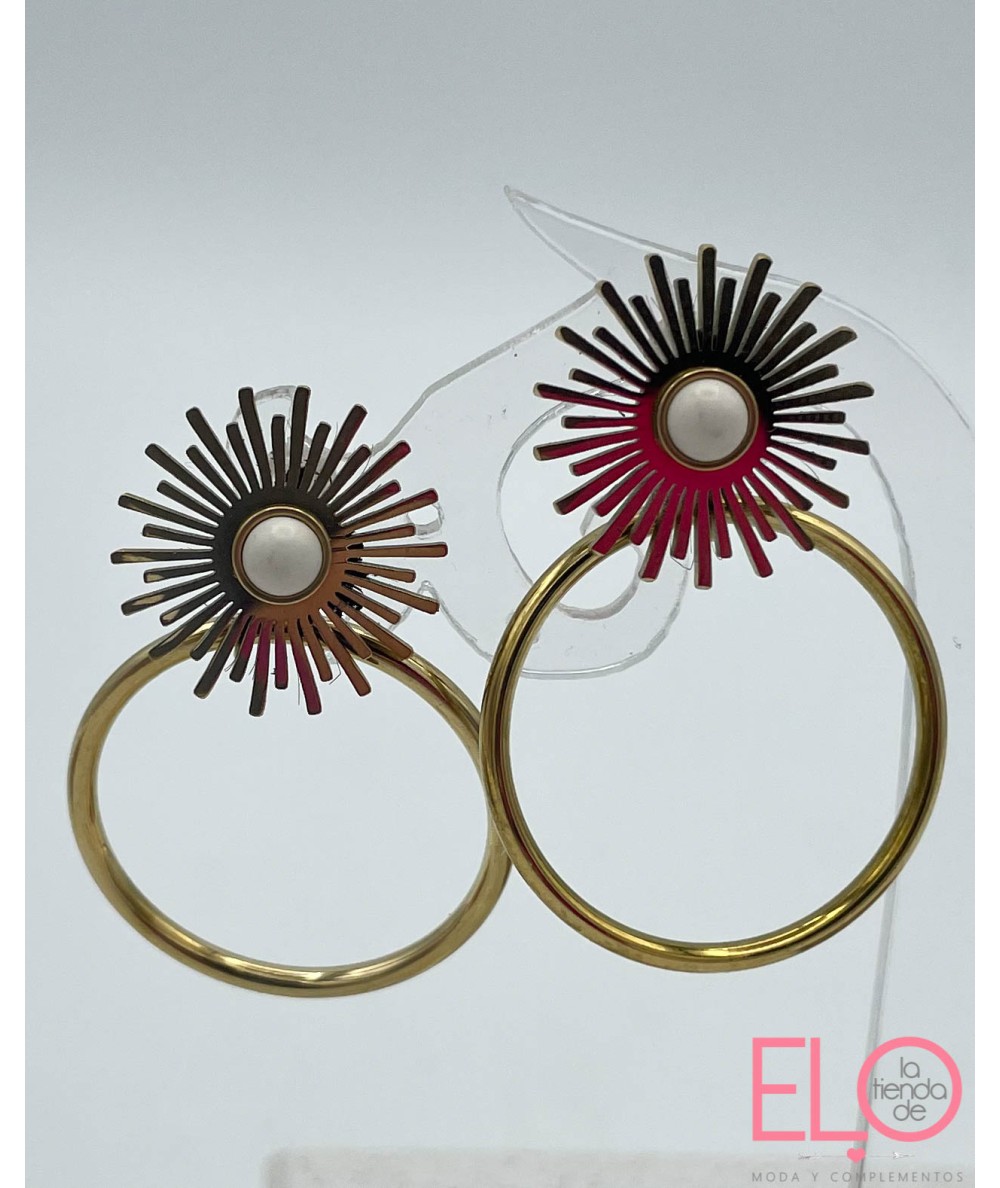 Lleva forma de sol con una piedra blanca en el centro y colgante de aro.
