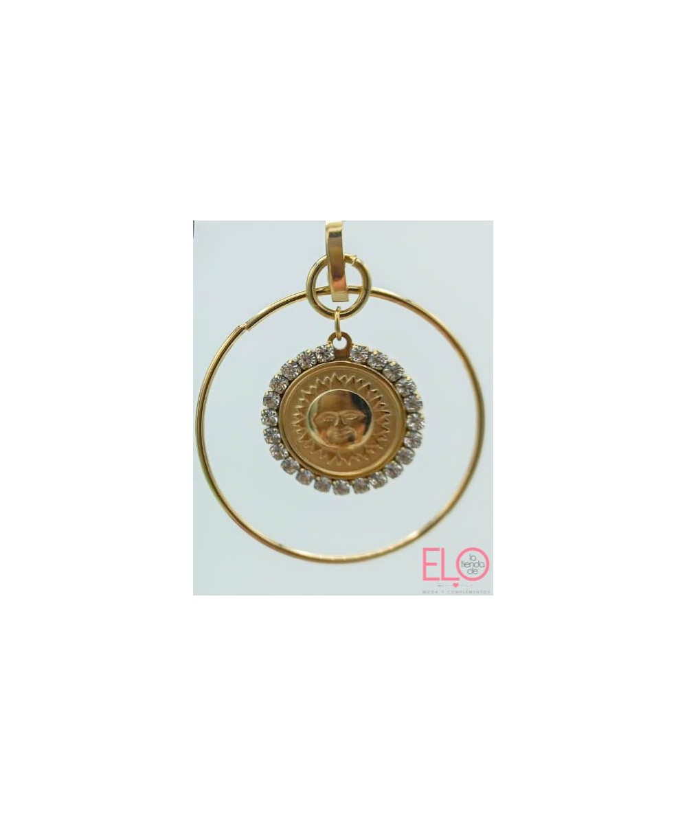 Lleva colgante de aros con un sol en el centro y piedrecitas brillantes.