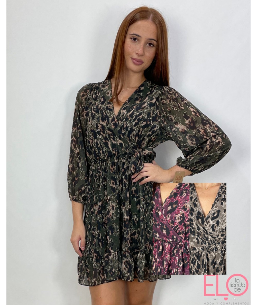 Vestido con estampado de serpiente, tejido camisero, con escote cruzado y goma en la cintura.