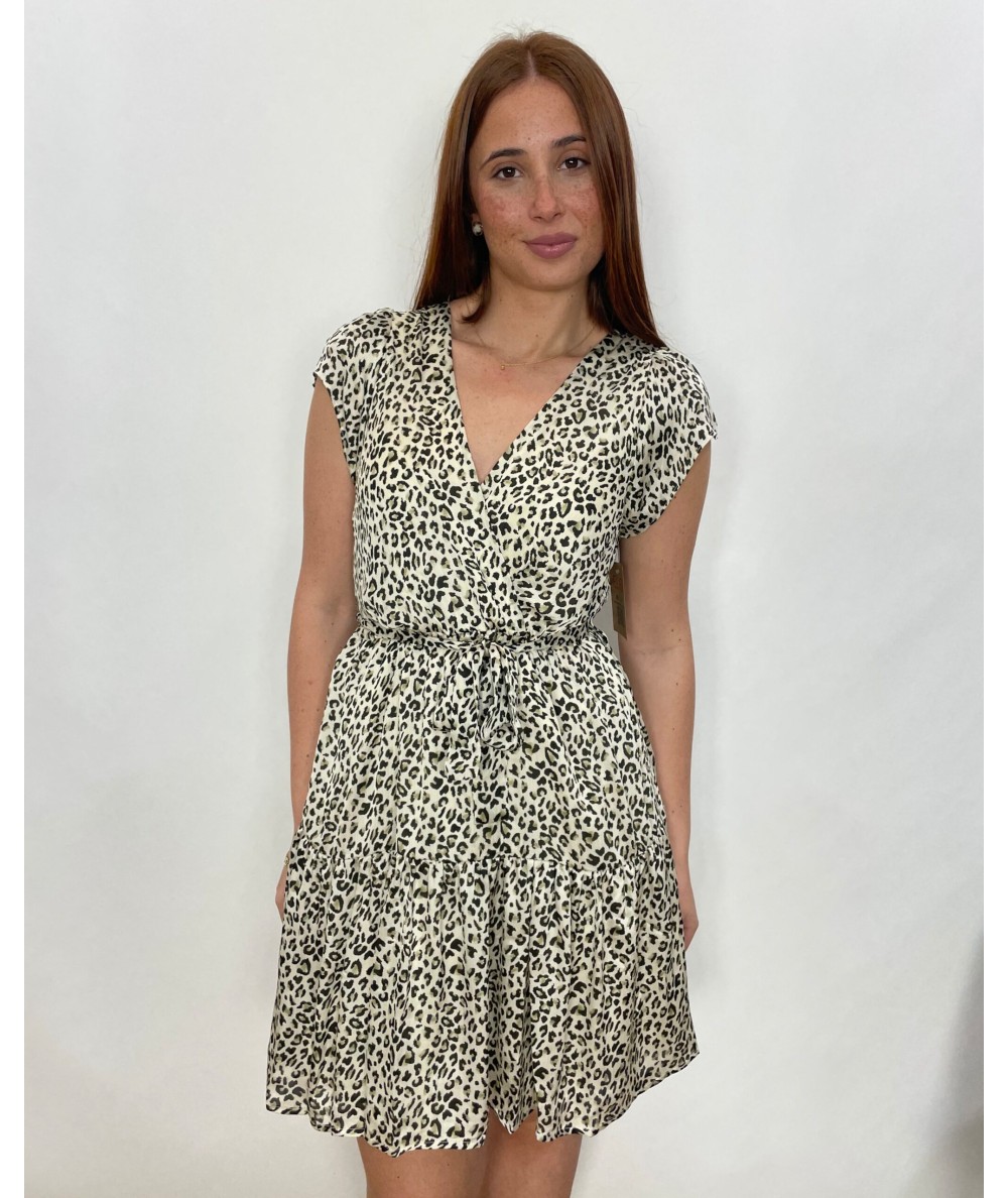 Vestido corto en tejido satinado con estampado de animal print de leopardo.
