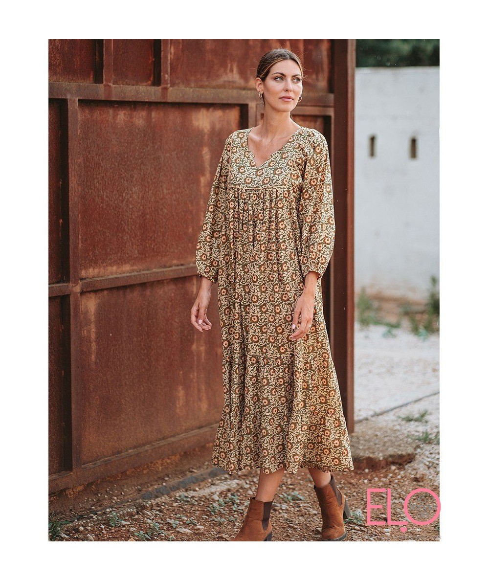 Vestido largo de fondo amarillo claro y verde con estampado de flores marrones.