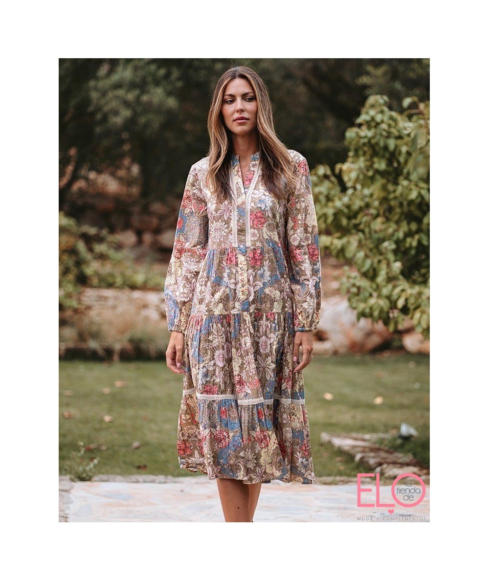 Vestido largo con estampado floral de colores verde, camel azul y rosa.