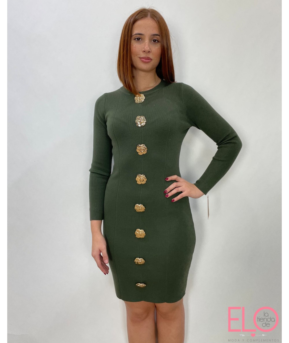 De manga larga, con detalle de botones en forma de flor de color dorado.
