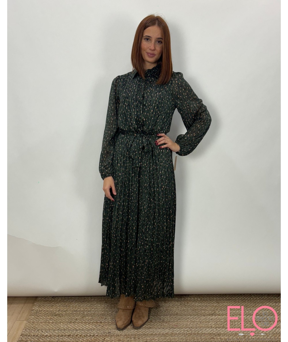 Vestido largo de color verde, con estampado de rayas negras y puntos de color rosa.