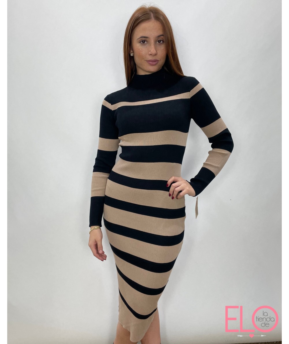 Vestido largo de punto con diseño a rayas de color negro y camel.