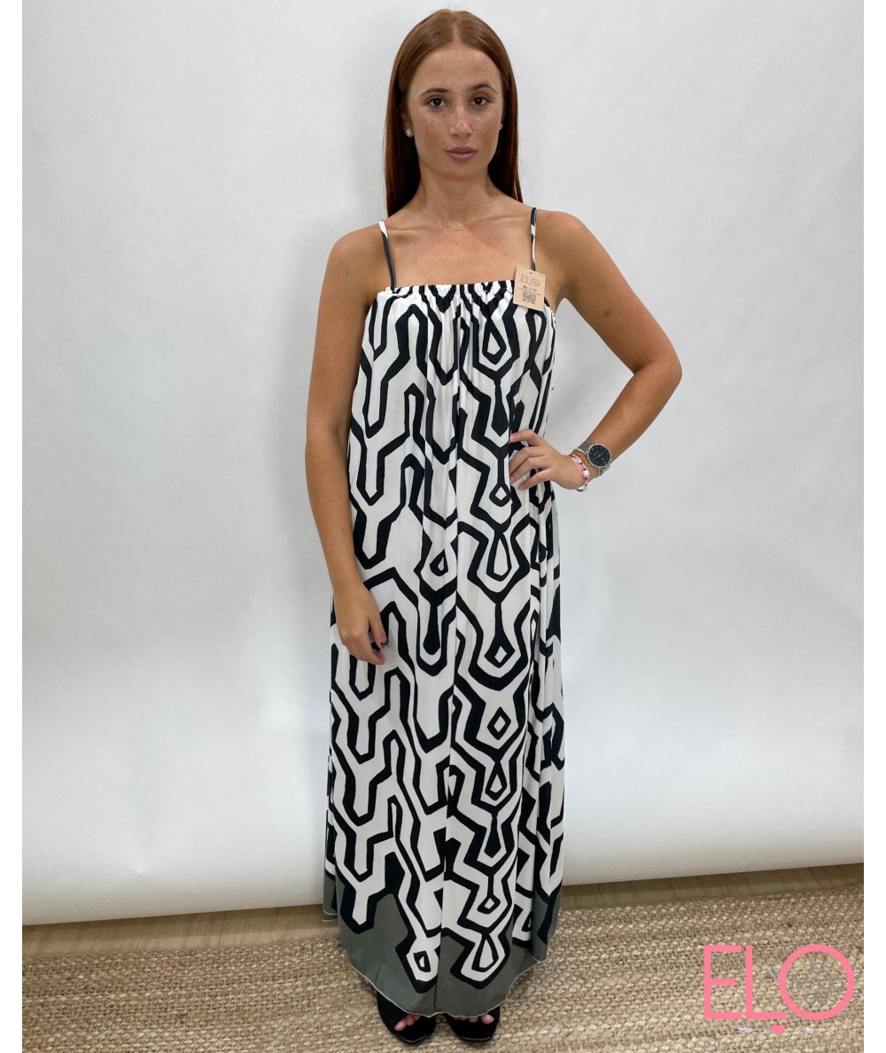 Vestido largo de fondo blanco con estampado de figuras negras.